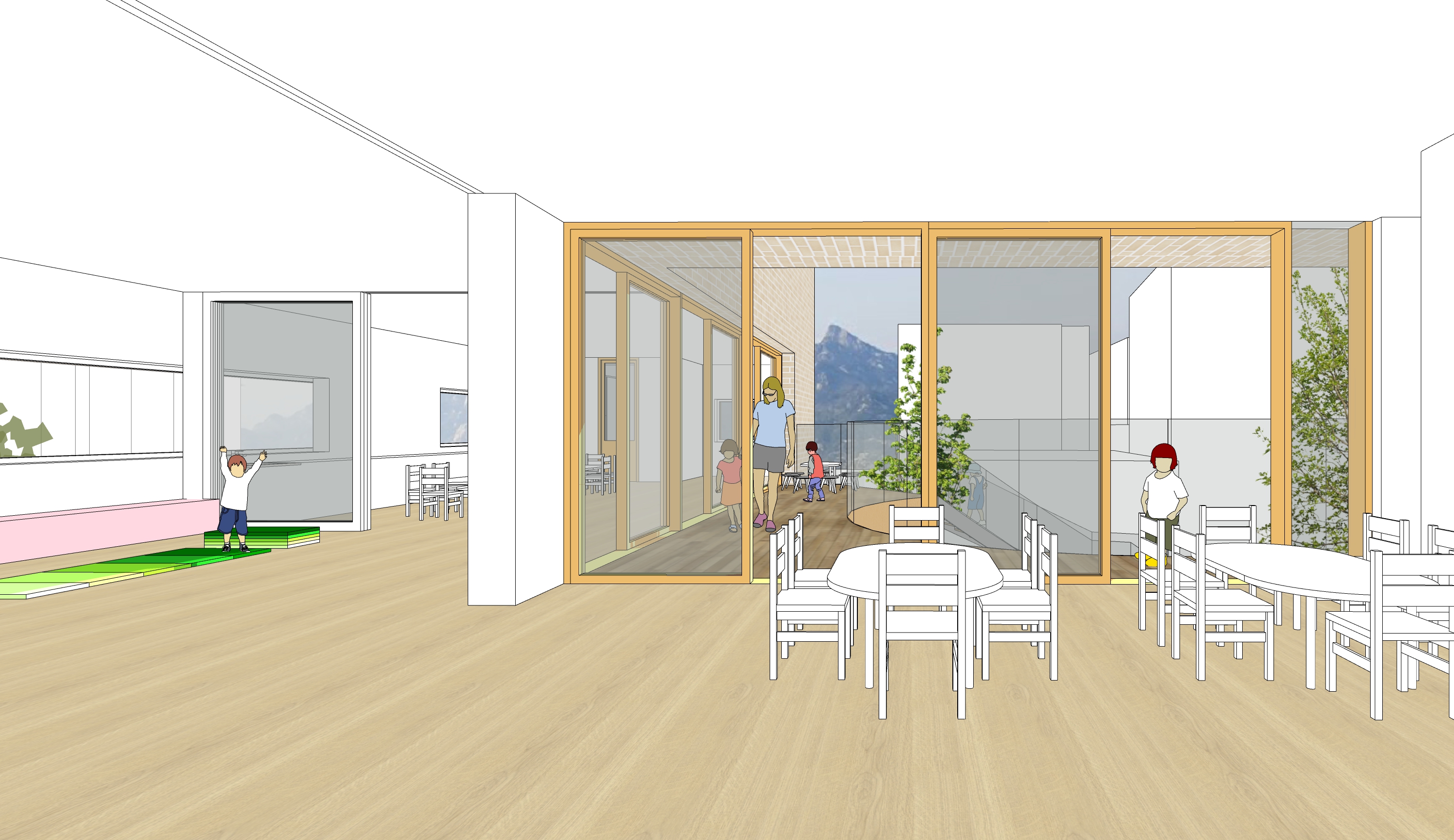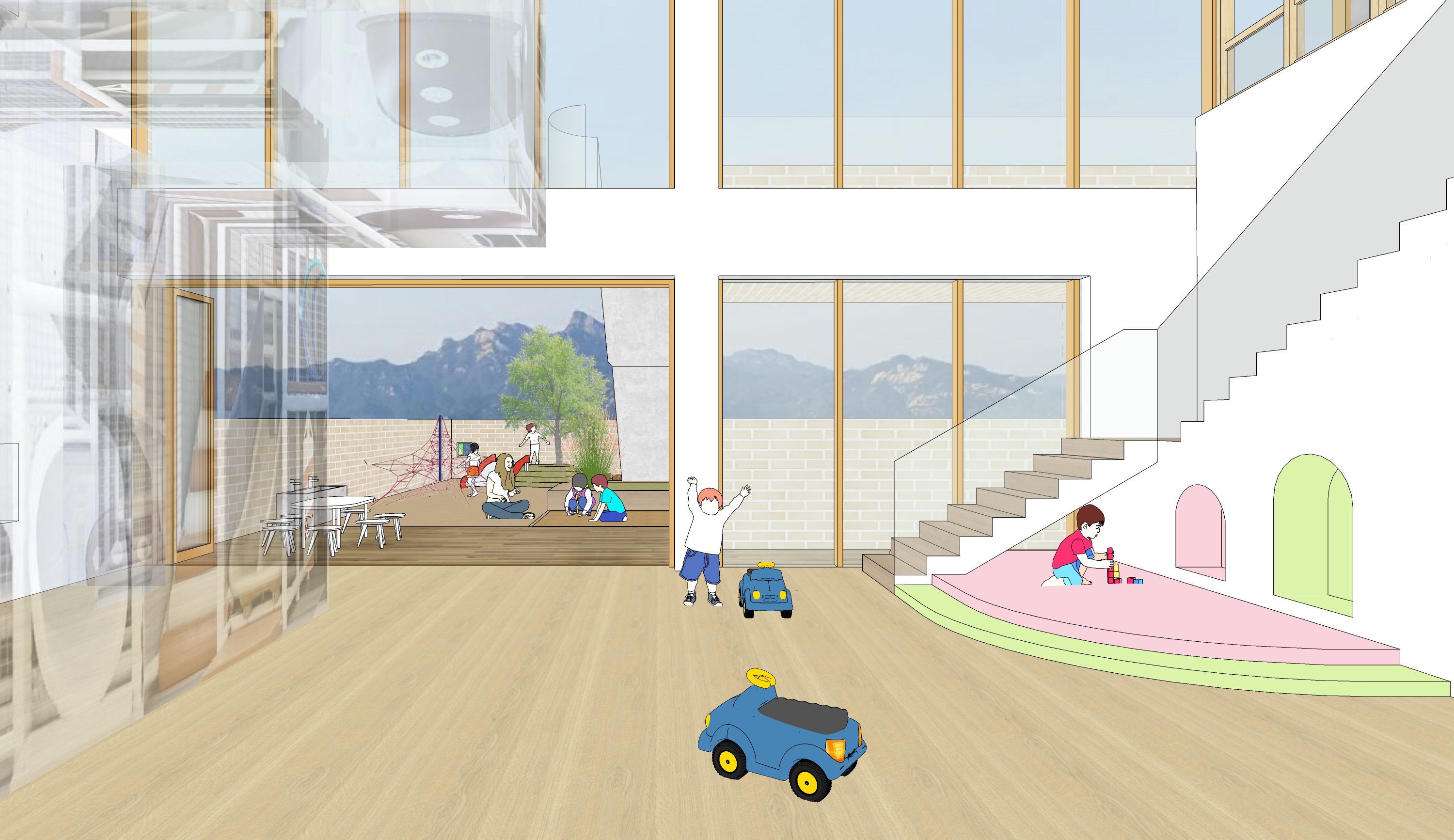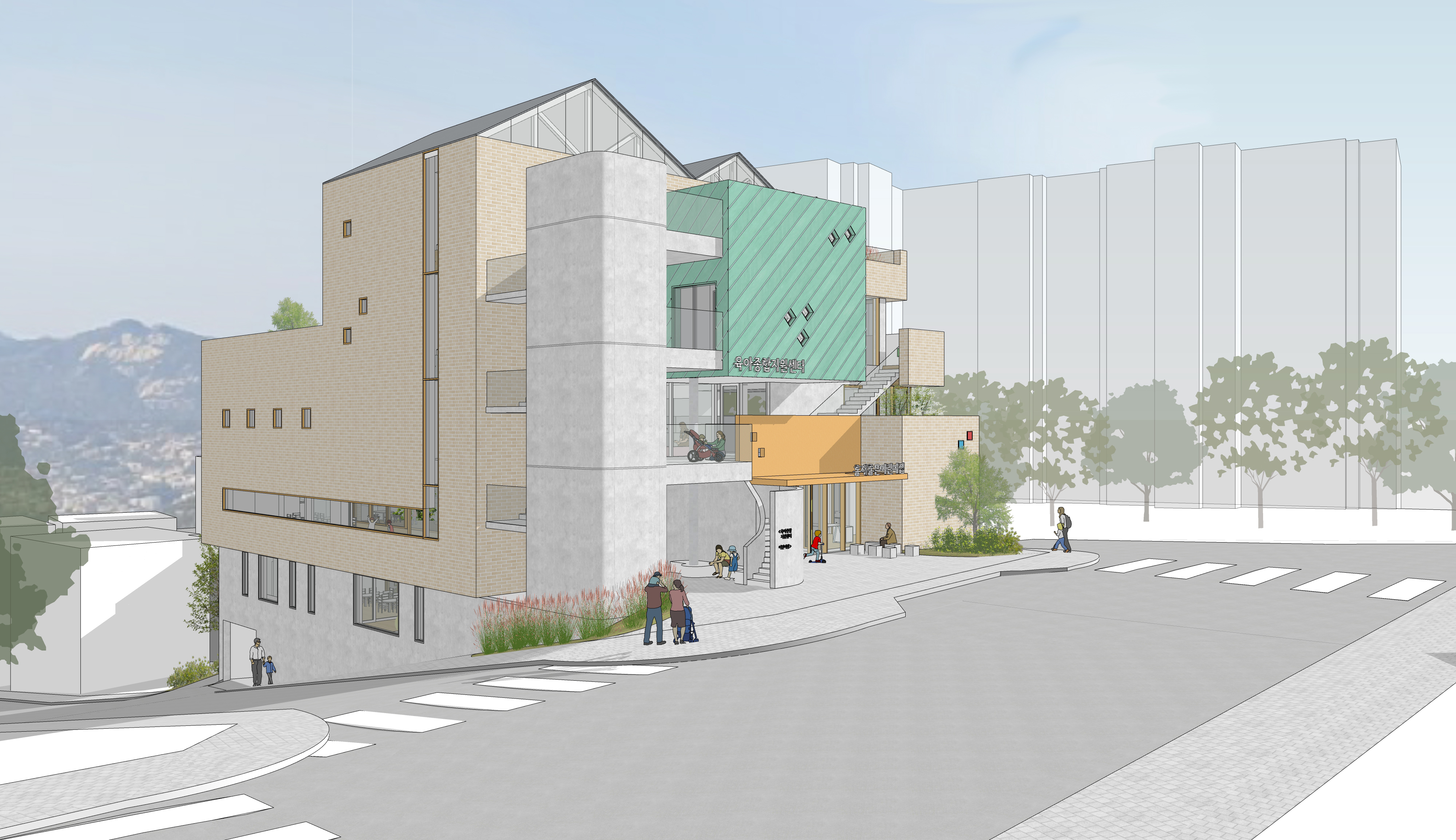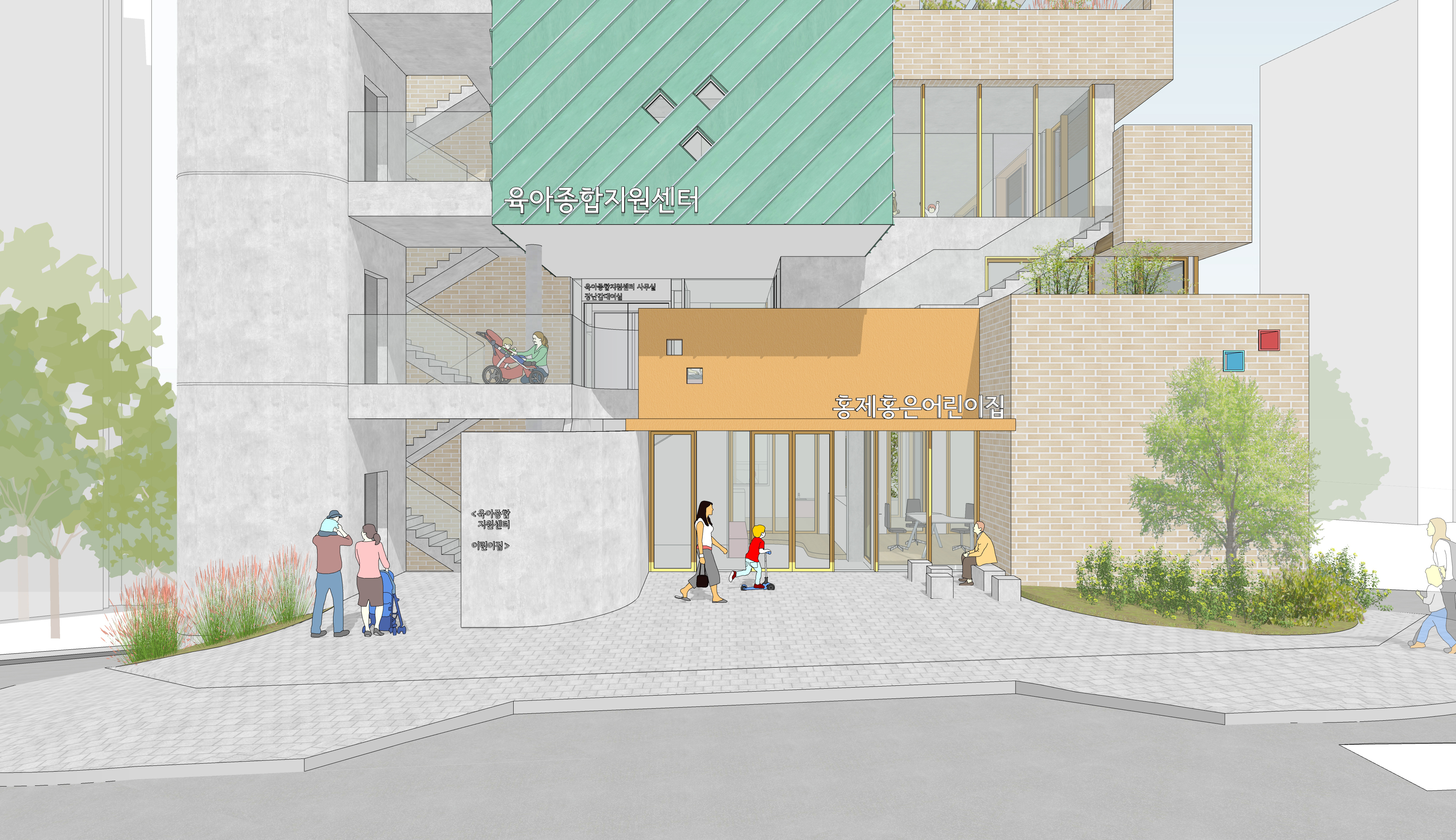 1-2층에 어린이집과 3-5층에 종합보육시설을 둔 통합시설입니다. 경사지를 적극적으로 활용하여 효율적으로 프로그램을 구성하고, 다양한 외부공간을 조성하는 것에 주안점을 둔 계획안입니다.