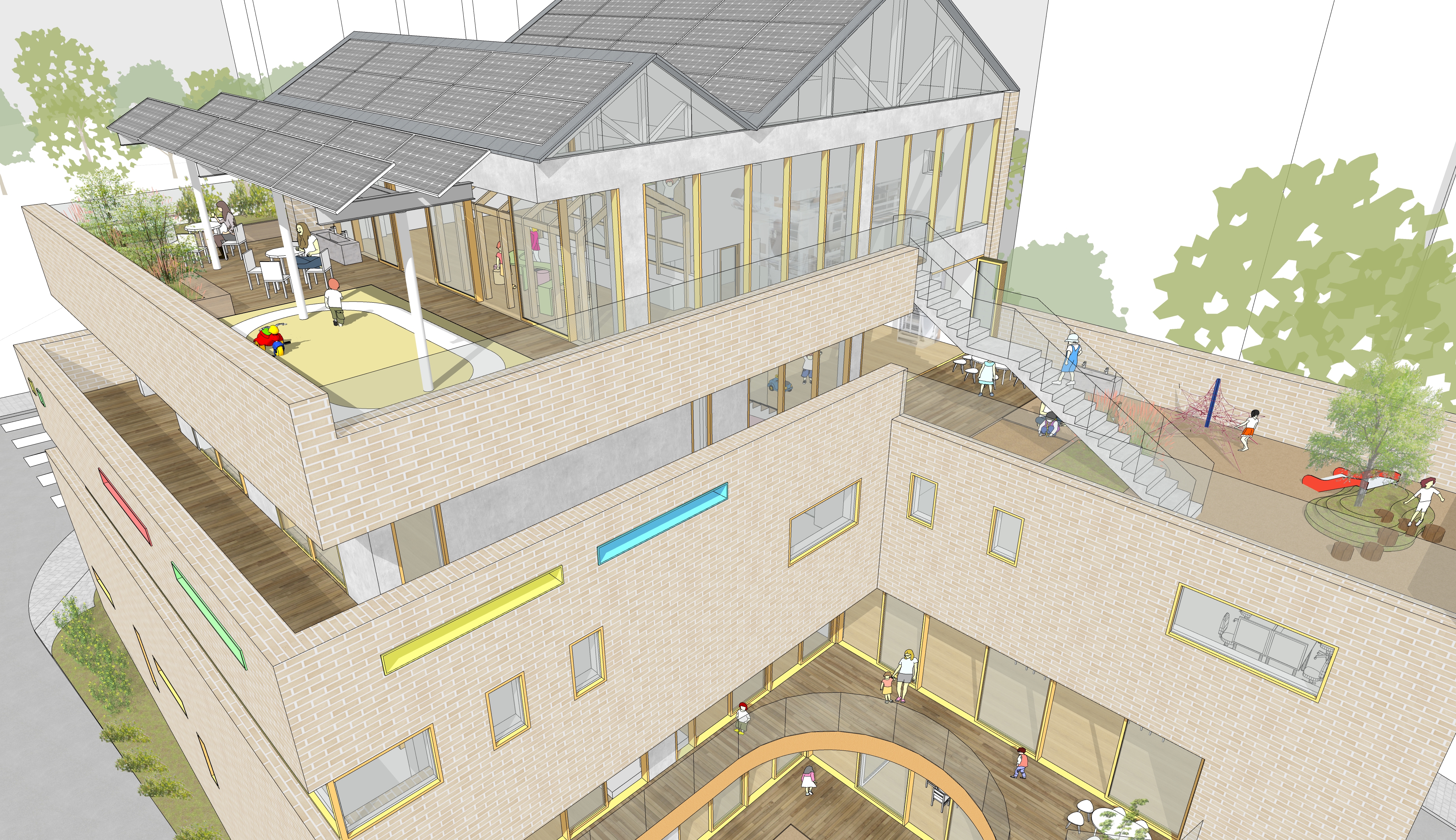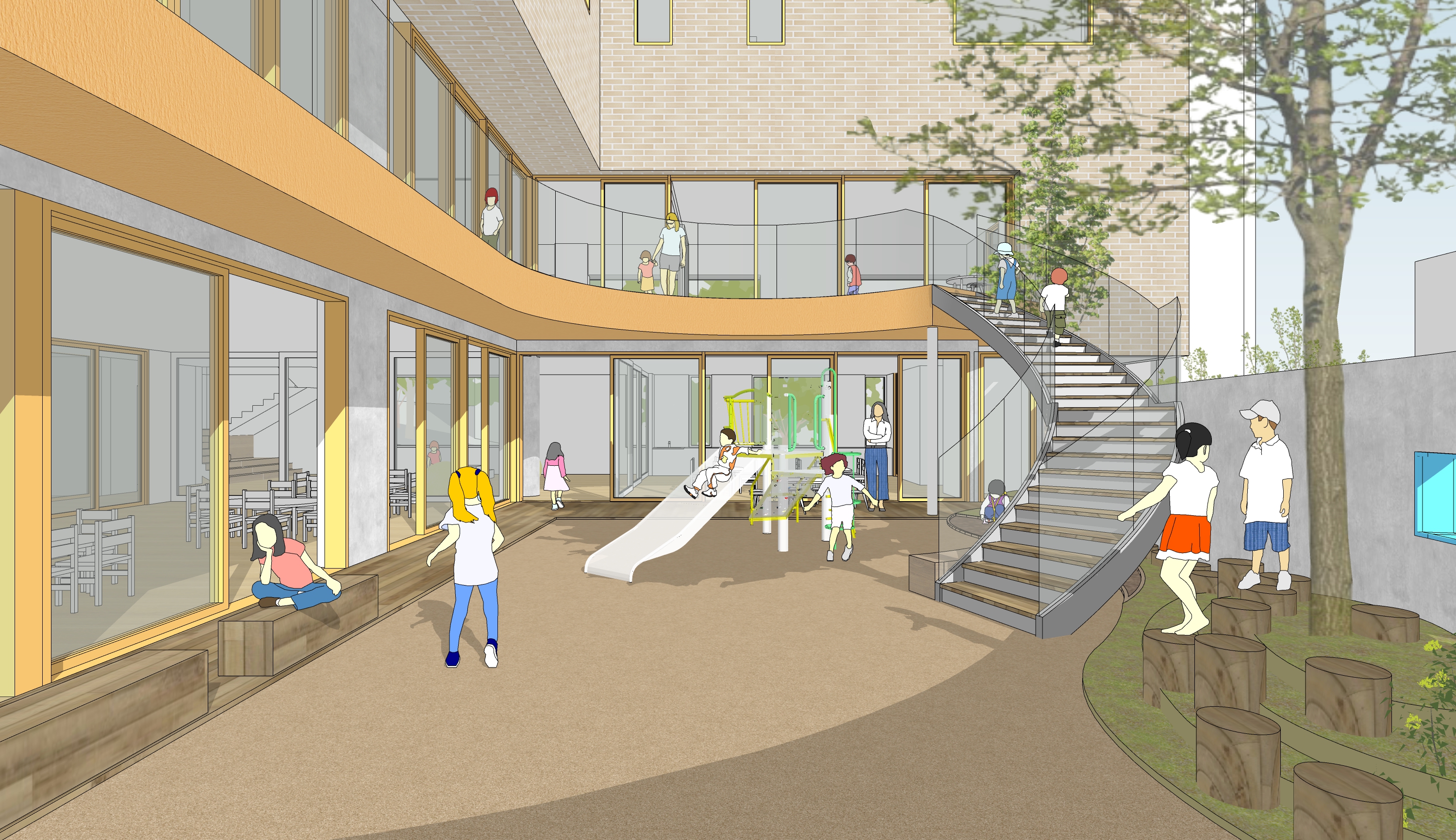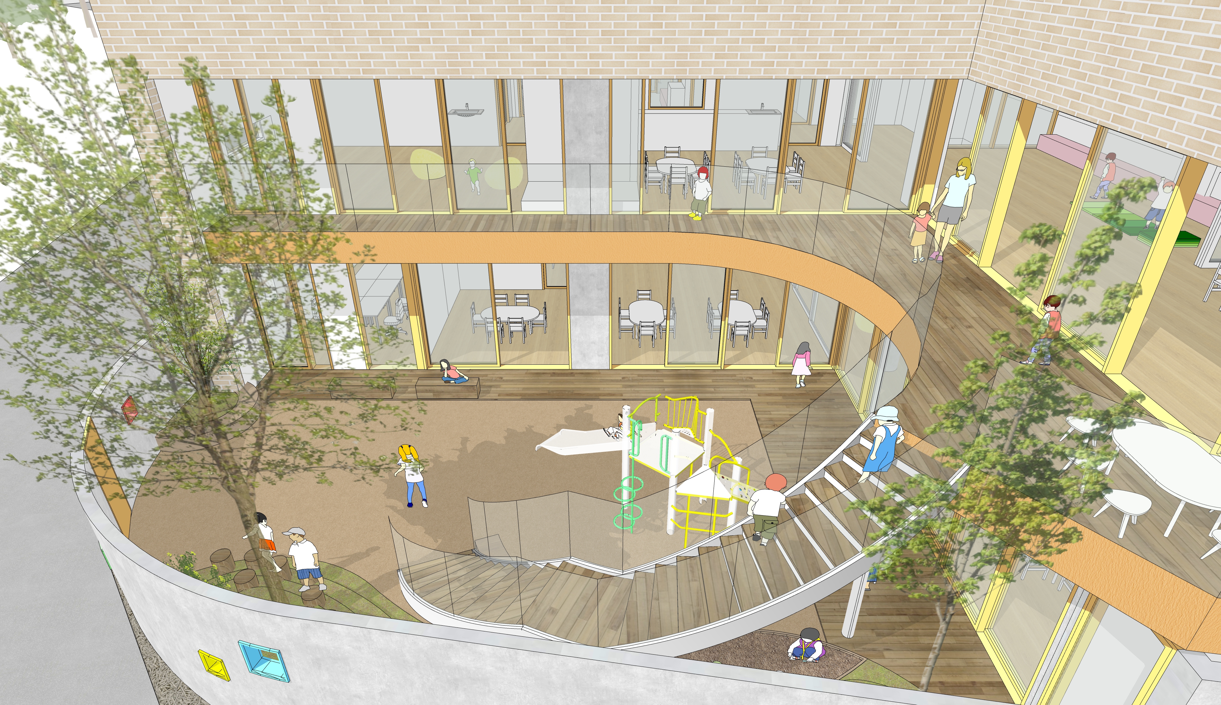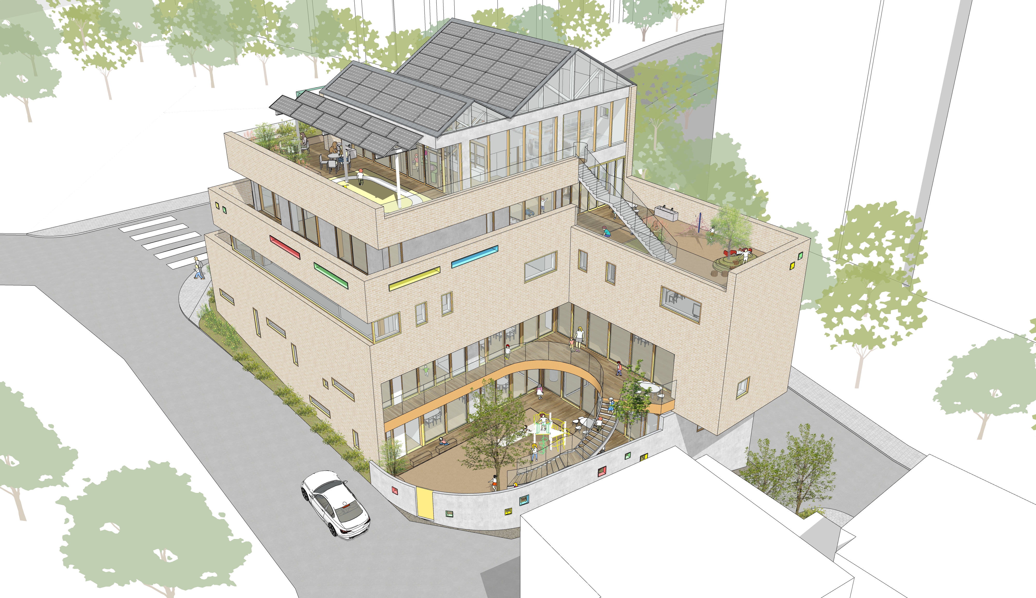 1-2층에 어린이집과 3-5층에 종합보육시설을 둔 통합시설입니다. 경사지를 적극적으로 활용하여 효율적으로 프로그램을 구성하고, 다양한 외부공간을 조성하는 것에 주안점을 둔 계획안입니다.