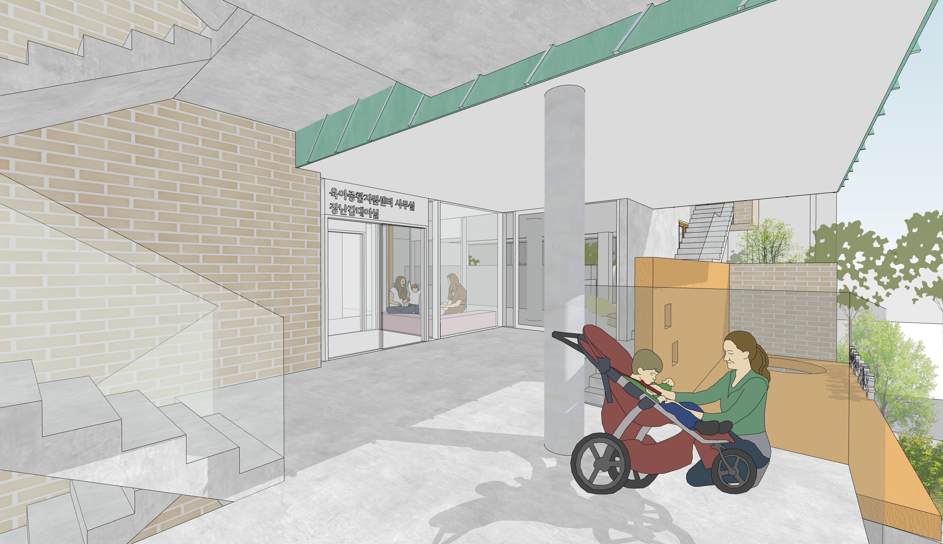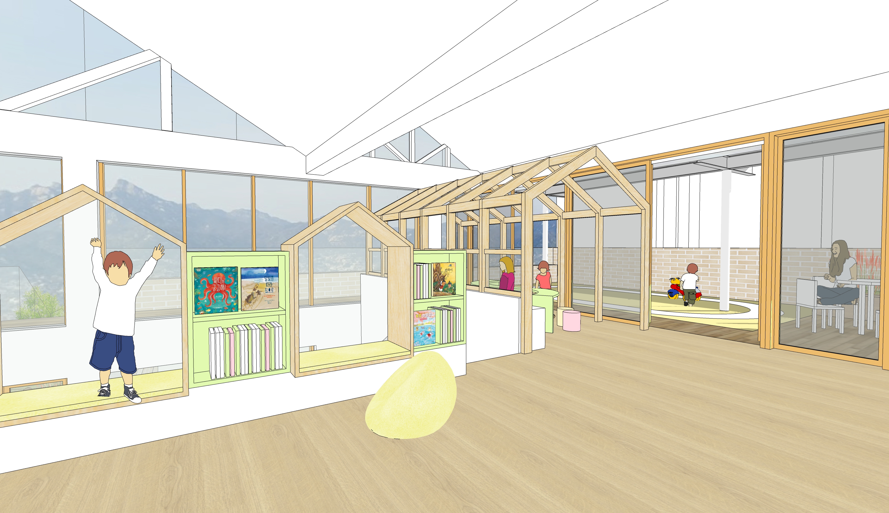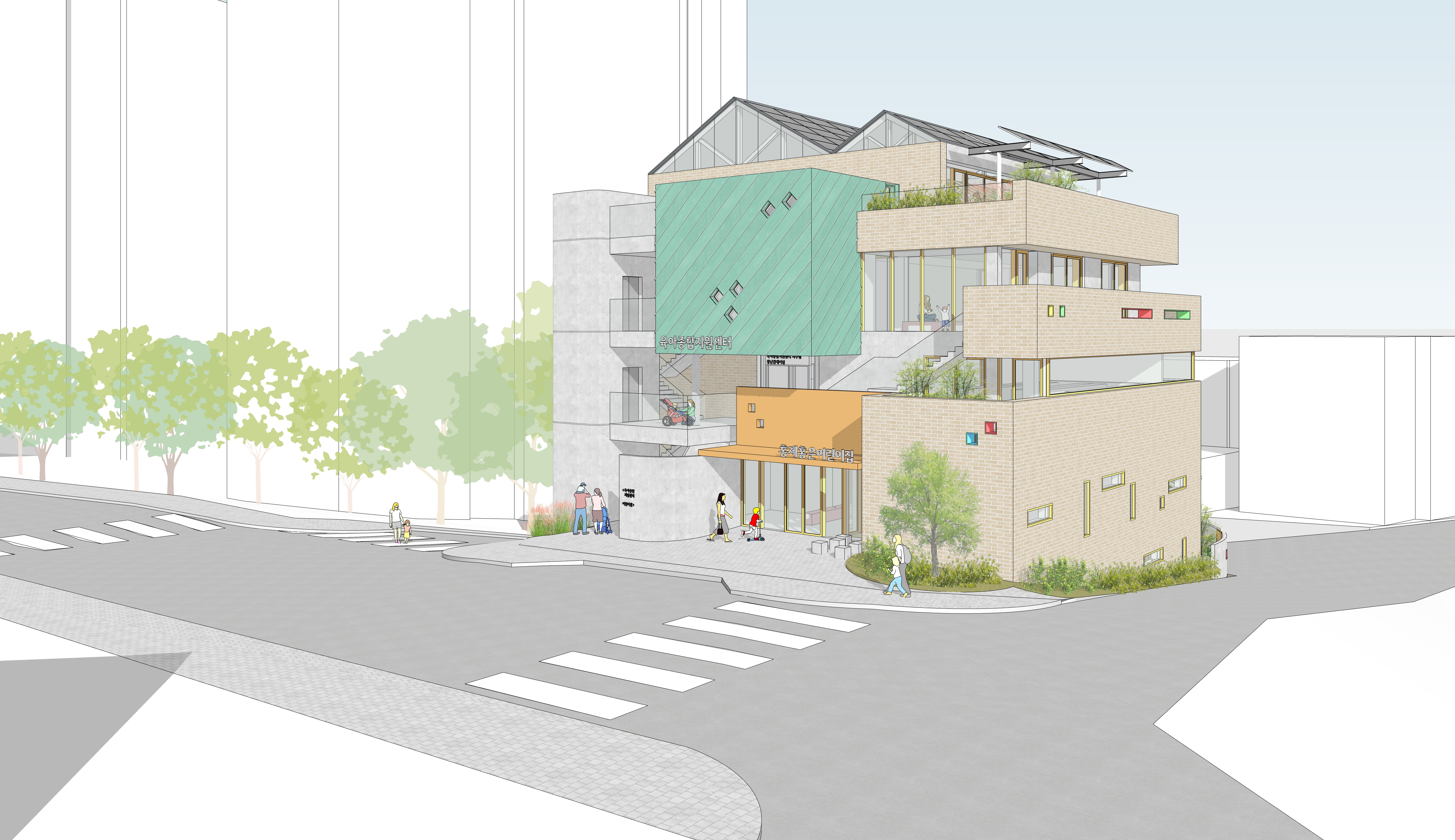 지역의 공공장소로서 부담없이 접근할 수 있고, 어린이 시설로서 재미있고 즐거운 장소의 이미지를 담은 건축물이 되고자 고민하였습니다. 아파트에 사는 아이들에게 외부의 공기와 햇빛을 가까이 경험하며 안와 밖을, 위와 아래를 오고 가며 놀 수 있는 환경을 제공해 주고자 했습니다.
